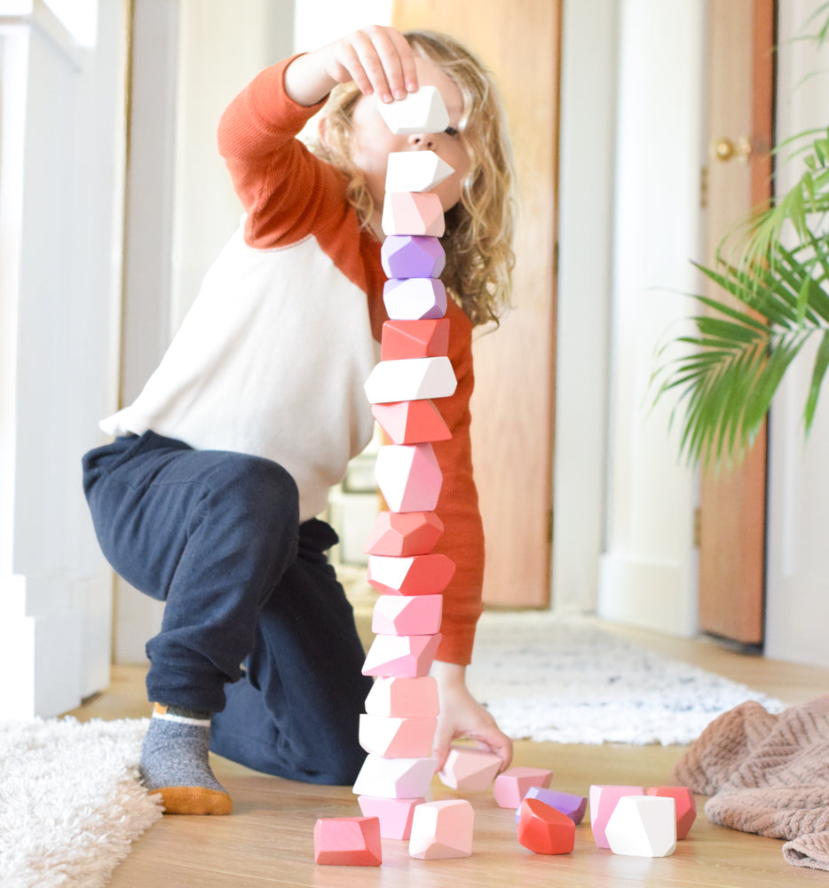 The 16-piece "Cupid" Rock Blocks set is a vibrant celebration of color and creativity, ideal for children who relish in imaginative play. This expansive set, with its captivating shades of pink, lilac purple, and cherry red, offers endless opportunities for building and creativity. Handcrafted in the USA, these Montessori wooden blocks foster open-ended play and enhance cognitive skills in older children and those ready for more complex challenges.