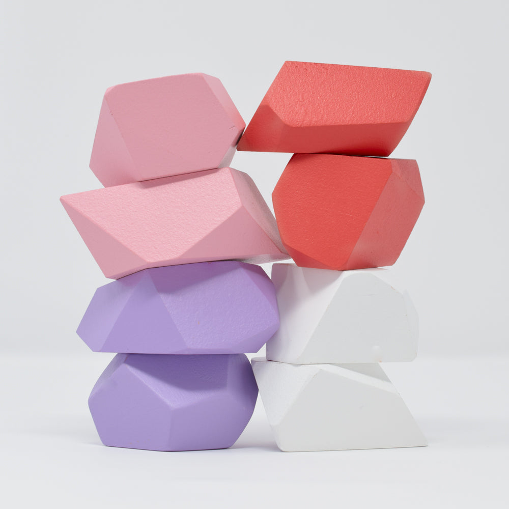 Celebrate love and creativity with our 8-piece "Cupid" Rock Blocks set, striking a perfect chord with pretty pinks, pops of lilac purple, and the vibrant cherry red. This set is an ideal Valentine's gift, inspiring young hearts to construct towers, arches, and more. Handcrafted in the USA, these Montessori wooden blocks foster open-ended play and ignite the imagination.