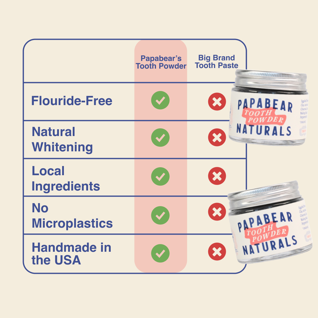 Everyday clean for a brighter, healthier smile. A simple blend—eggshell calcium, bentonite clay, baking soda, activated coconut charcoal, and organic peppermint—gently polishes, whitens, and strengthens enamel. Supports gum health, helps neutralize cavity-causing acids, and eases sensitivity for strong teeth. No parabens or dyes—ever.