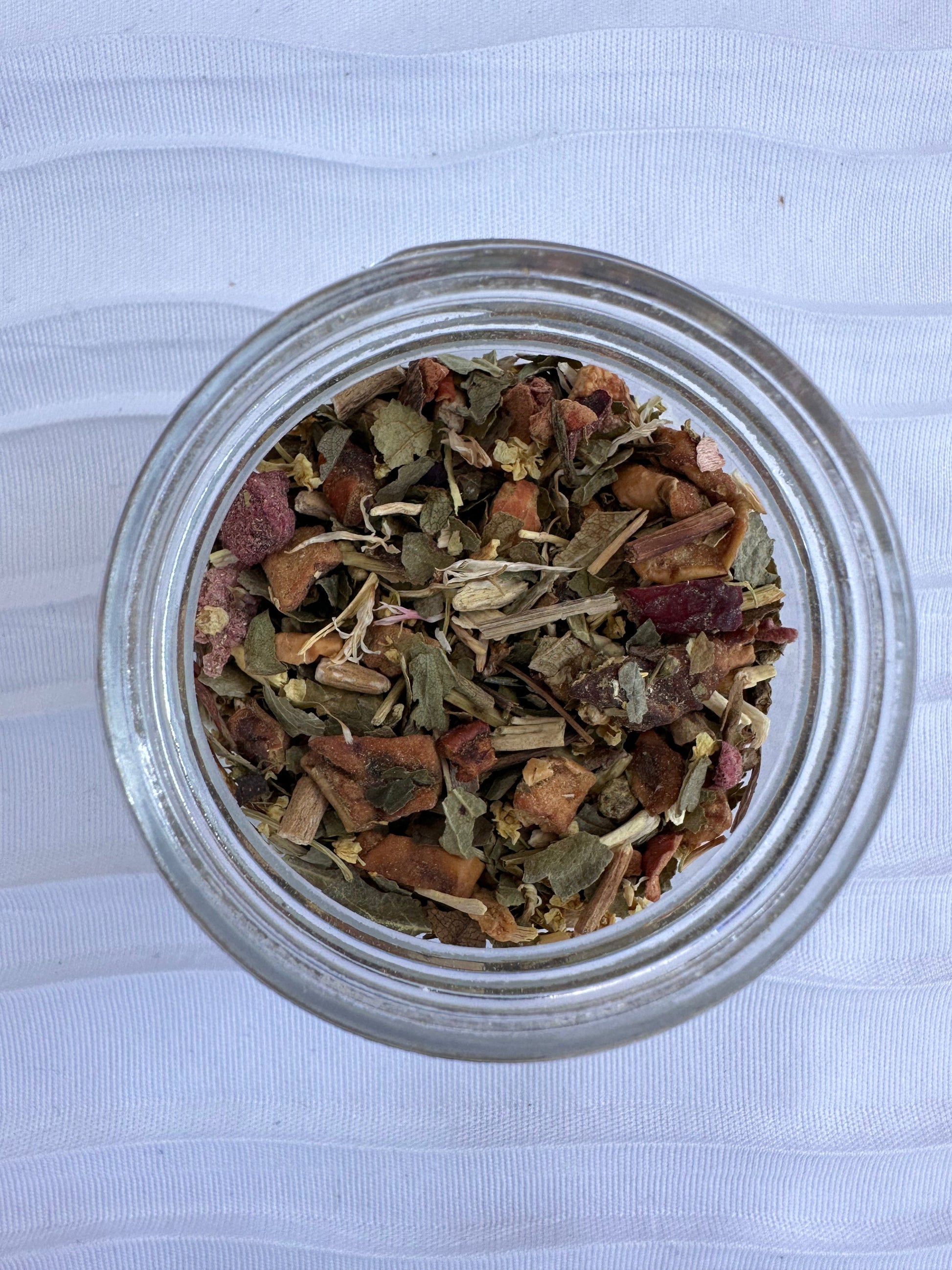 Ingredients: dried apple, mullein, strawberry leaf, ashwagandha root, elderflower, dried cranberries, freeze-dried strawberries, cornflower petals, pure extract.